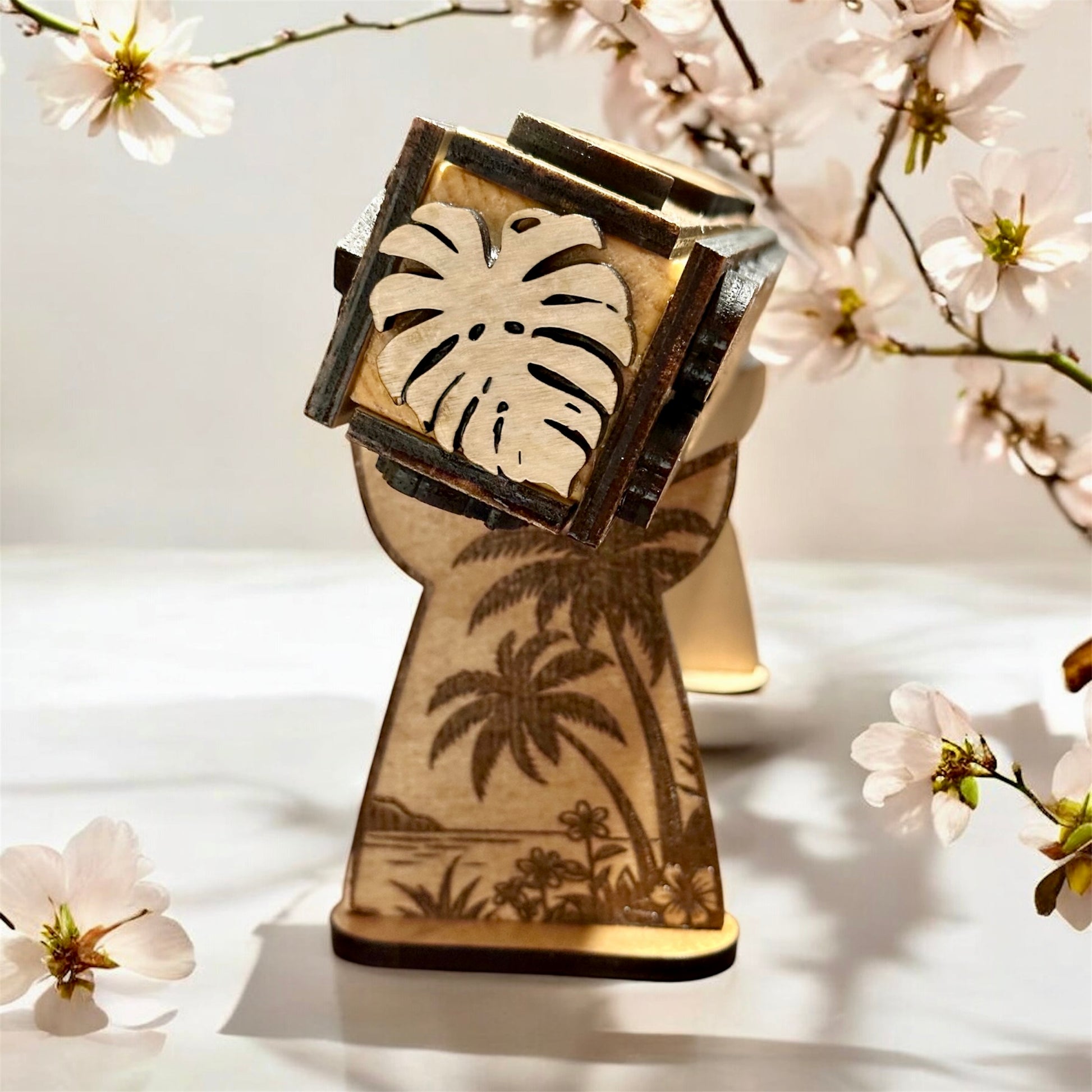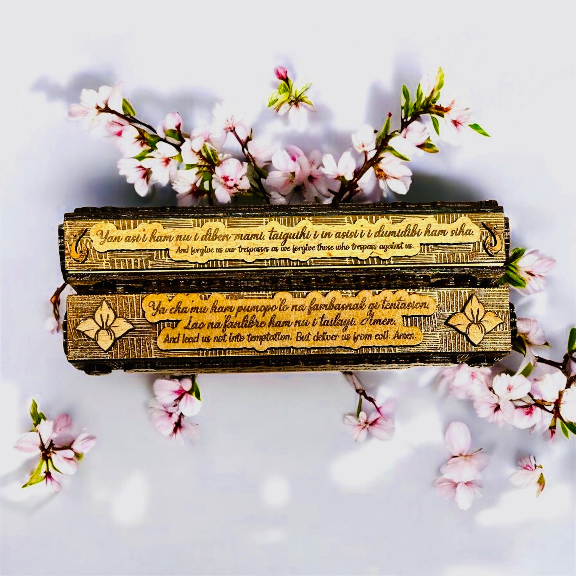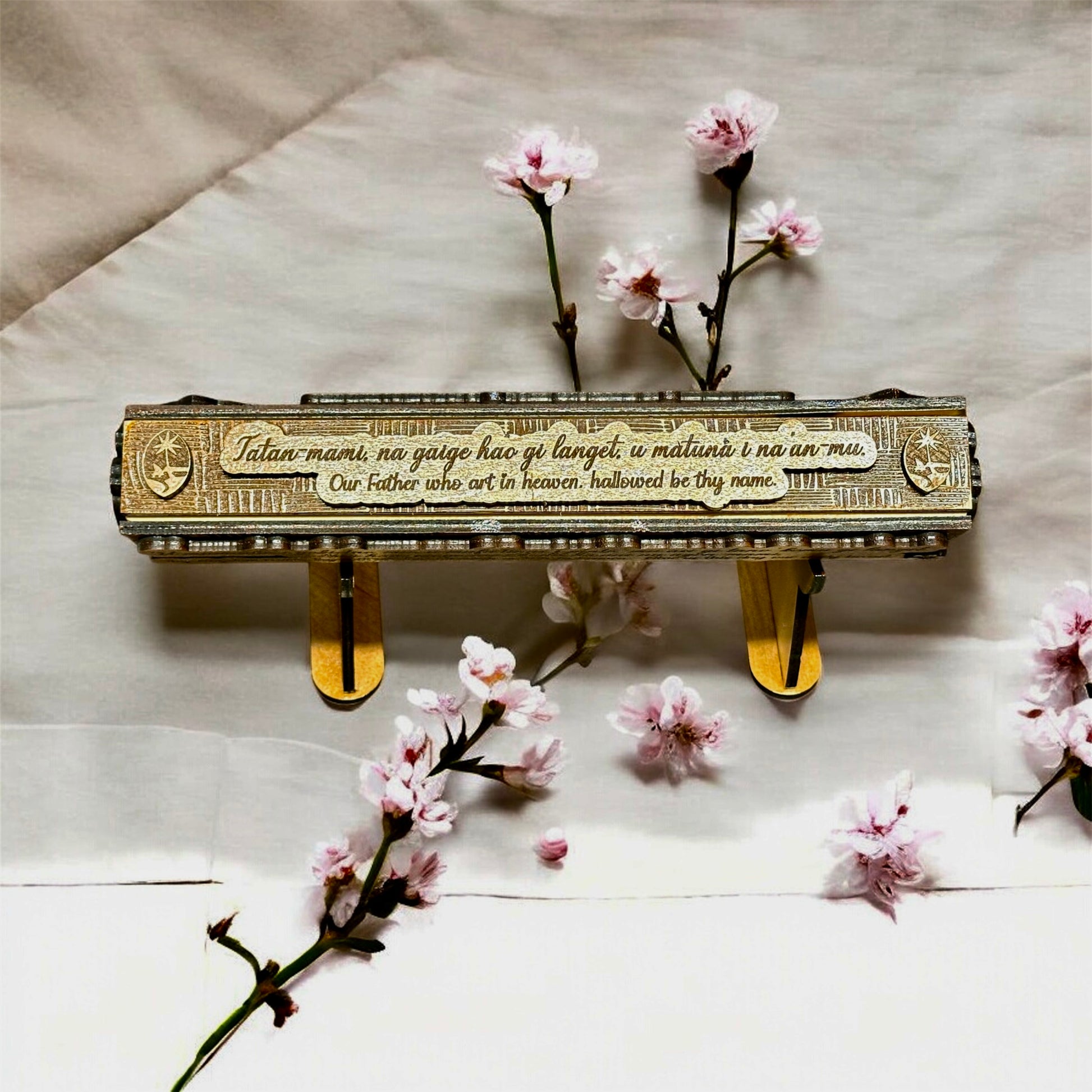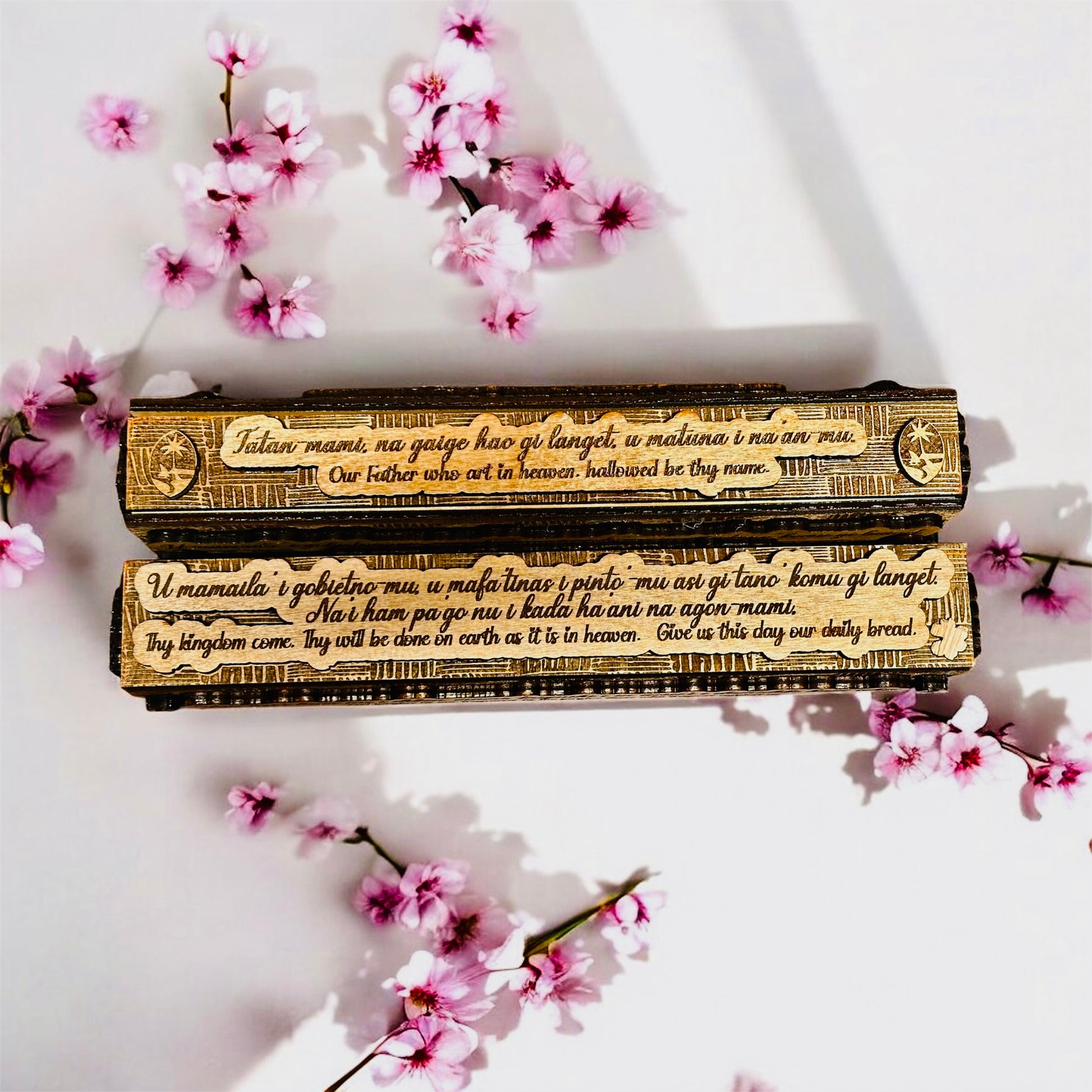 Each side of the scroll is engraved with a verse from Tåtan-måmi (The Lord’s Prayer) in Chamorro, with the English translation elegantly displayed below. As you turn the scroll, you can read the full prayer, accompanied by symbols of island life on each side — a meaningful touch that celebrates Guam’s rich heritage.