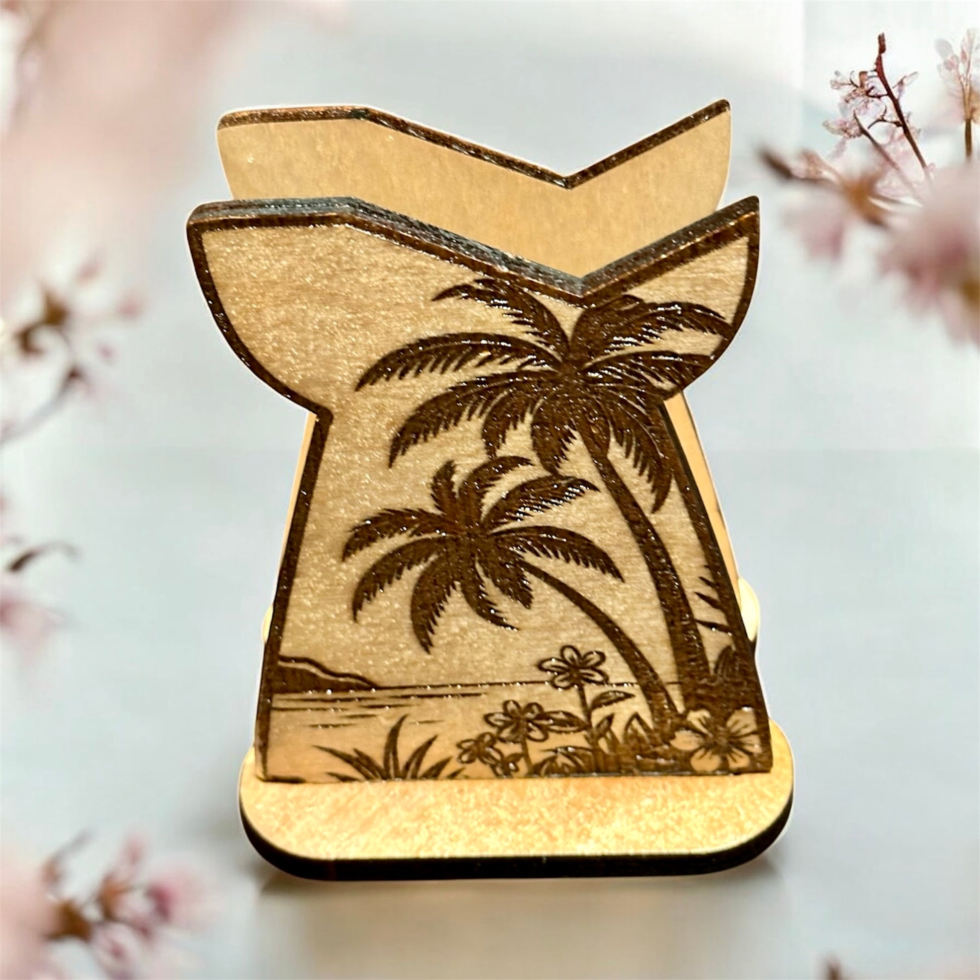 The scroll rests on a latte stone stand, featuring an intricate design of island scenery within the stone — a timeless emblem of strength and Chamorro identity.